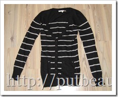 This next tunic is a heaver sweater-like fabric. It’s hard to tell from the photo but it is a dark navy-purple colour with short sleeves and a cute button detail near the neckline. This will look great with dark skinny jeans and camel coloured pumps. It is very fitted but a light brown belt around the waist could add some extra detail to this top. I think that the tunic would work well paired with some white capri pants as well. The combination of the white and blue would give a nautical effect that is very in for spring. This tunic was $20 as well marked down from $44.90.